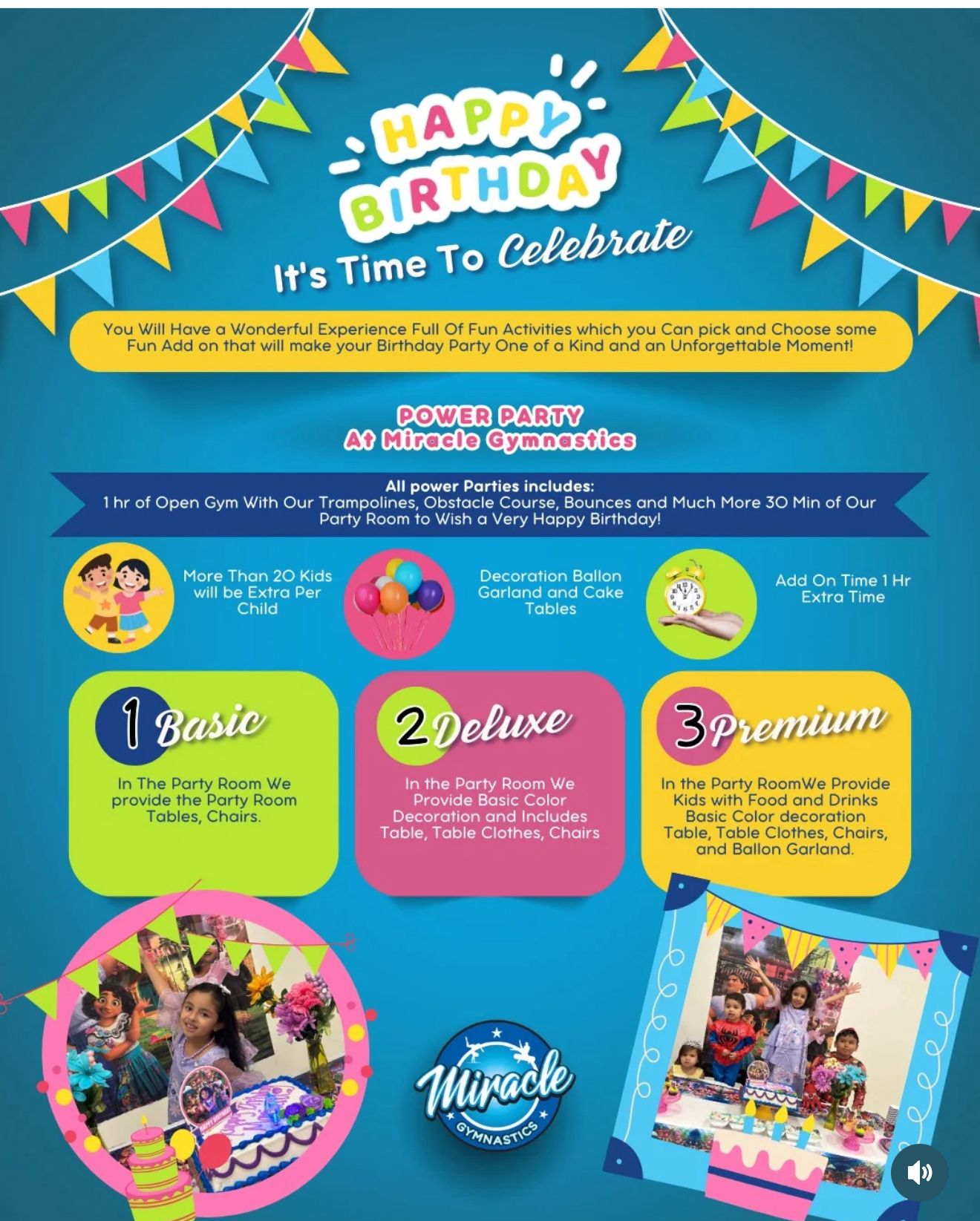 At Miracle, we aim to provide every child with a unique party experience. You can choose your own theme and decorate the room to your liking. If you'd prefer a simpler option, we offer standard tablecloths, plates, plasticware, cups, and napkins at no additional cost. We ensure a fun and safe environment for children of all ages.